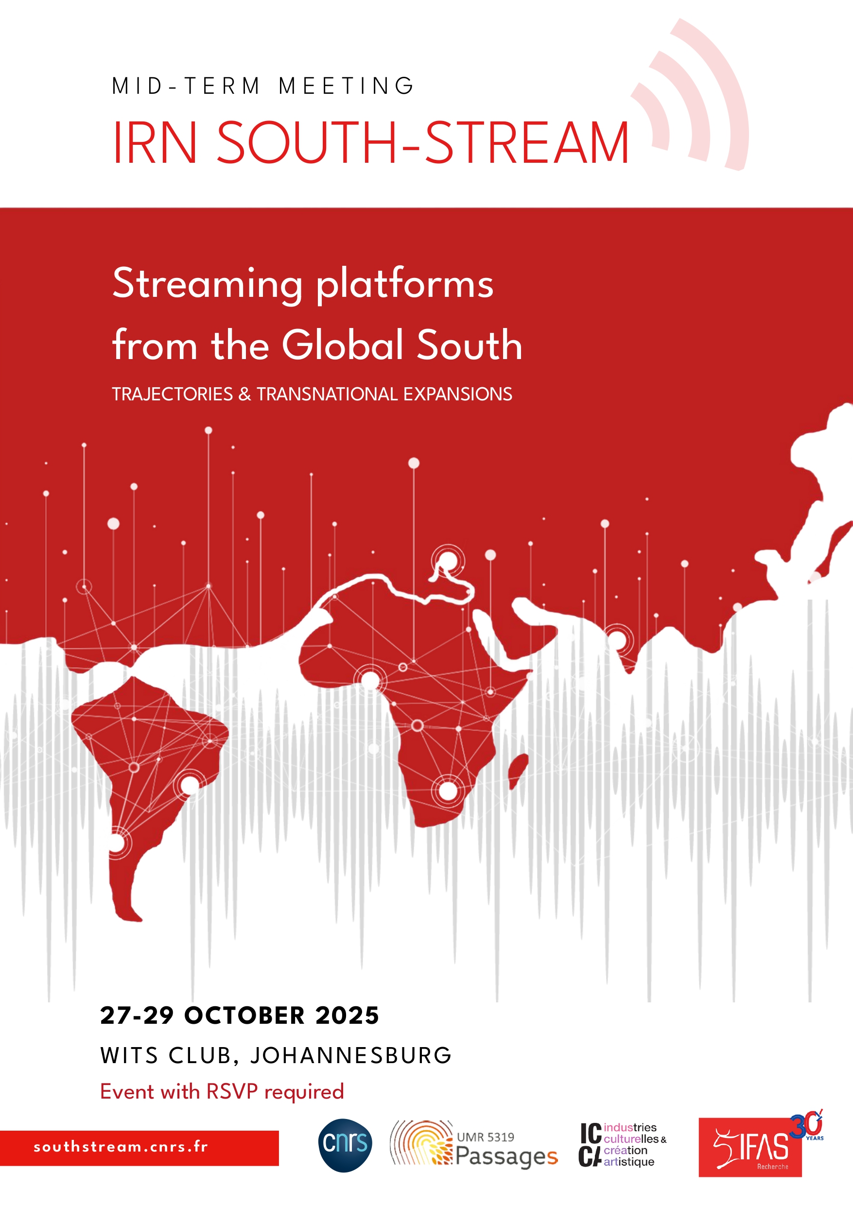 L’ International Research Network (IRN) South-Stream organise son colloque de mi-programme intitulé “Streaming Platforms from the Global South – Trajectories and Transnational Expansions” du 27 au 29 octobre 2025 au Wits Club (Université de Witwatersrand), avec le soutien de l’IFAS-Recherche.
