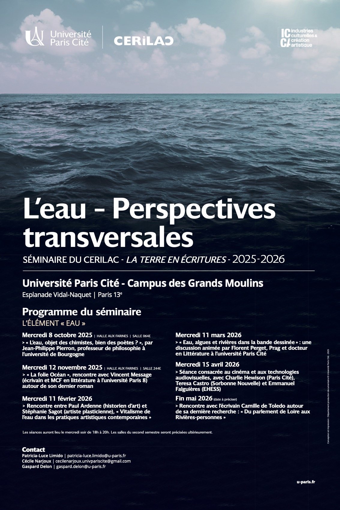 Cette année 2025 étant l’Année de la Mer, nous porterons notre attention sur l’eau, la mer, l’océan, les rivières, afin de décliner les différentes manières de traiter l’élément « eau » dans l’entrecroisement des créations artistiques contemporaines, des médias et des sciences humaines.